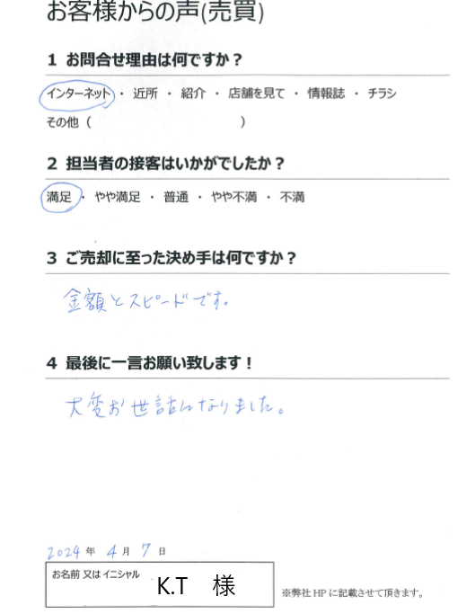 ご売却の金額とスピード等、ご満足いただけるご契約ができたこと嬉しく思います。
